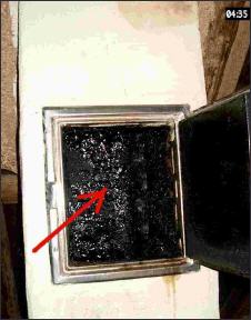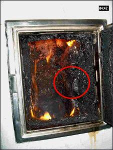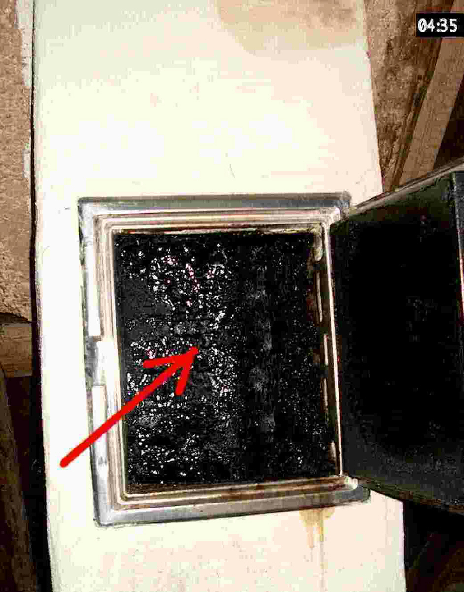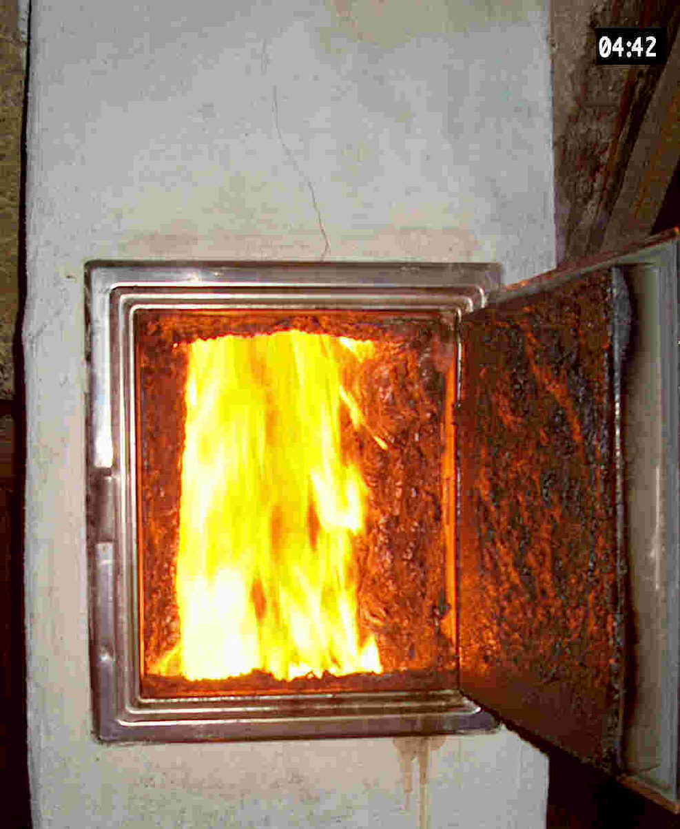 Glanzruß im Schornstein hier an der oberen Kamintüre deutlich sichtbar |